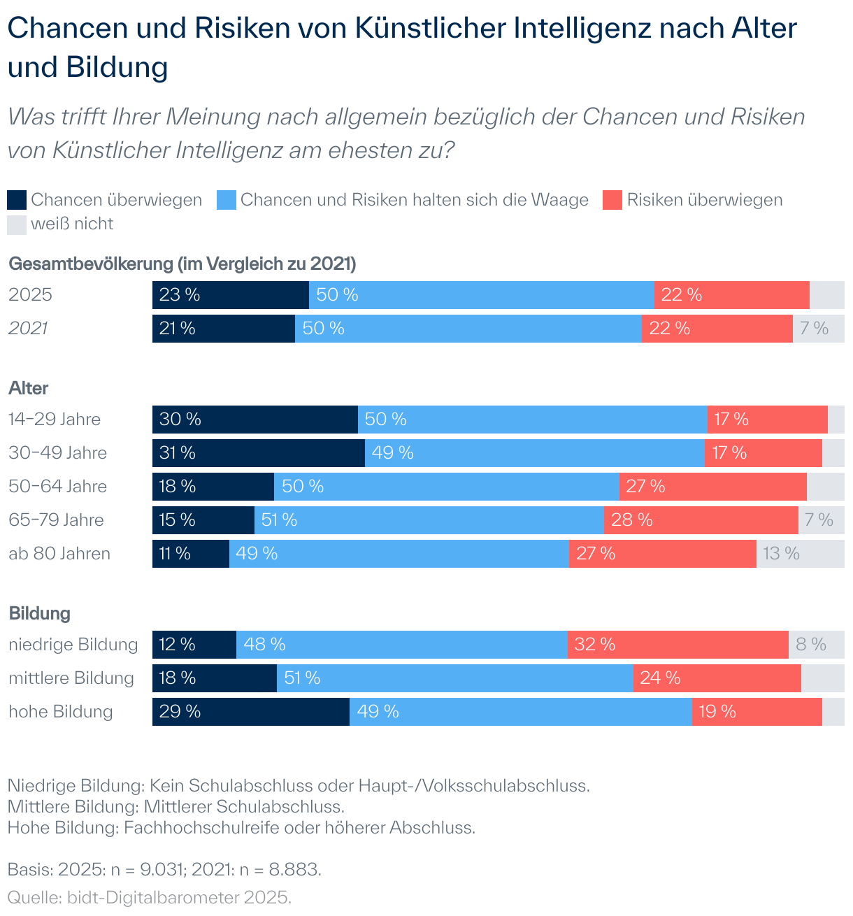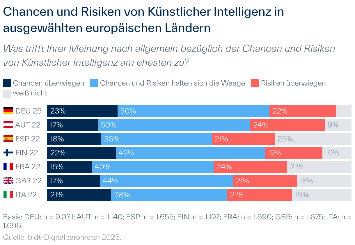 Die Mehrheit der Bevölkerung in Deutschland und ausgewählten weiteren europäischen Ländern gibt an, dass sich beim Einsatz von KI Chancen und Risiken die Waage halten. Die andere Hälfte der Bevölkerung ist in ihrer Einschätzung gespalten: Für 22 % überwiegen die Risiken von KI, für 23 % die Chancen.