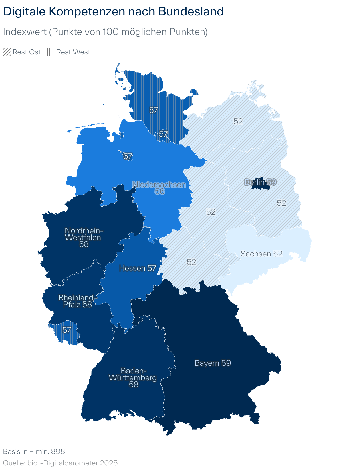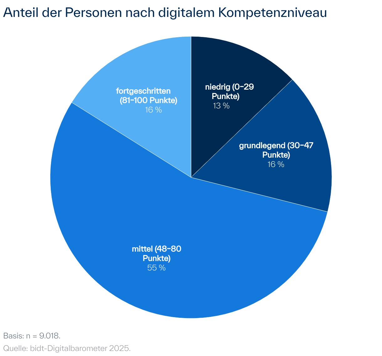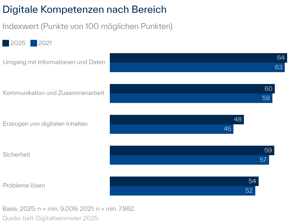 Basierend auf dem europäischen Referenzrahmen für digitale Kompetenzen (kurz DigComp) der Gemeinsamen Forschungsstelle (Joint Research Center) der Europäischen Kommission werden im bidt-Digitalbarometer die digitalen Kompetenzen mithilfe des Selbsteinschätzungstests DigCompSAT (Clifford et al. 2020) in Deutschland repräsentativ erhoben. Der Test besteht aus insgesamt 82 Einzelaussagen zu fünf Kompetenzbereichen. Bei den digitalen Kompetenzen zeigen sich sowohl Unterschiede nach soziodemographischen Merkmalen als auch zwischen einzelnen Bundesländern.