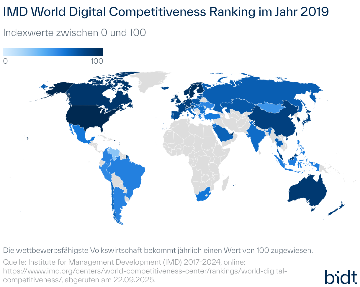 Für das Ranking betrachtet das IMD die drei Dimensionen Wissen, Technologie und Zukunftsfähigkeit. Diese bestehen wiederum aus jeweils drei Unterkategorien. In der Kategorie Wissen wird untersucht, inwieweit ein Land Knowhow im Bereich der digitalen Technologien besitzt. Die Kategorie Technologie erfasst, welche (ökonomischen) Rahmenbedingungen in einem Land vorhanden sind, um digitale Technologien eigenständig entwickeln zu können. Die dritte Kategorie – Zukunftsfähigkeit – untersucht, inwieweit ein Land dazu in der Lage ist, die digitale Transformation nutzen und von ihr profitieren zu können. Jede Kategorie besitzt dabei das gleiche Gewicht für das Gesamtranking. Insgesamt wurden zuletzt 59 Indikatoren für das abschließende Ranking der Länder untersucht und ausgewertet.