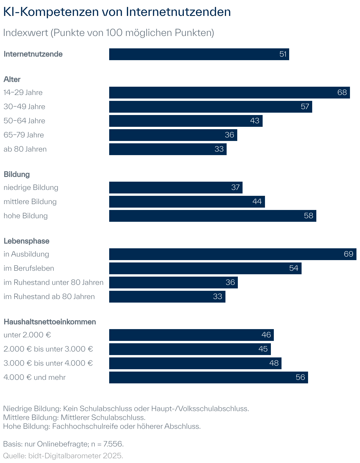 Die durchschnittliche KI-Kompetenz internetnutzender Personen in Deutschland beträgt 2025 51 von maximal 100 Punkten. Dabei zeigen sich ausgeprägte Klüfte nach Alter, Bildungsniveau sowie dem Haushaltsnettoeinkommen der Befragten.