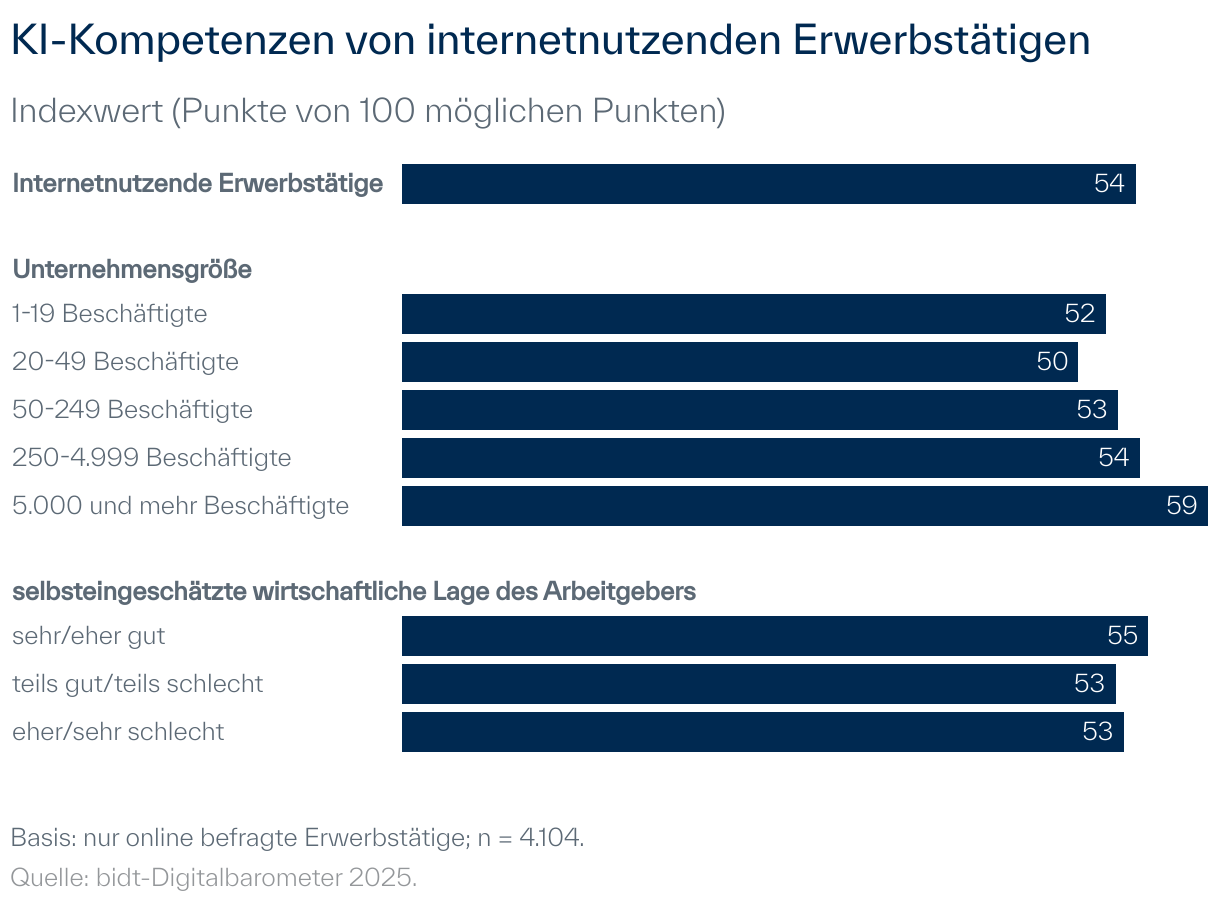 Bei internetnutzenden Erwerbstätigen ist zusätzlich ein positiver Zusammenhang zwischen KI-Kompetenz und der Anzahl der Mitarbeitenden des eigenen Unternehmens erkennbar.