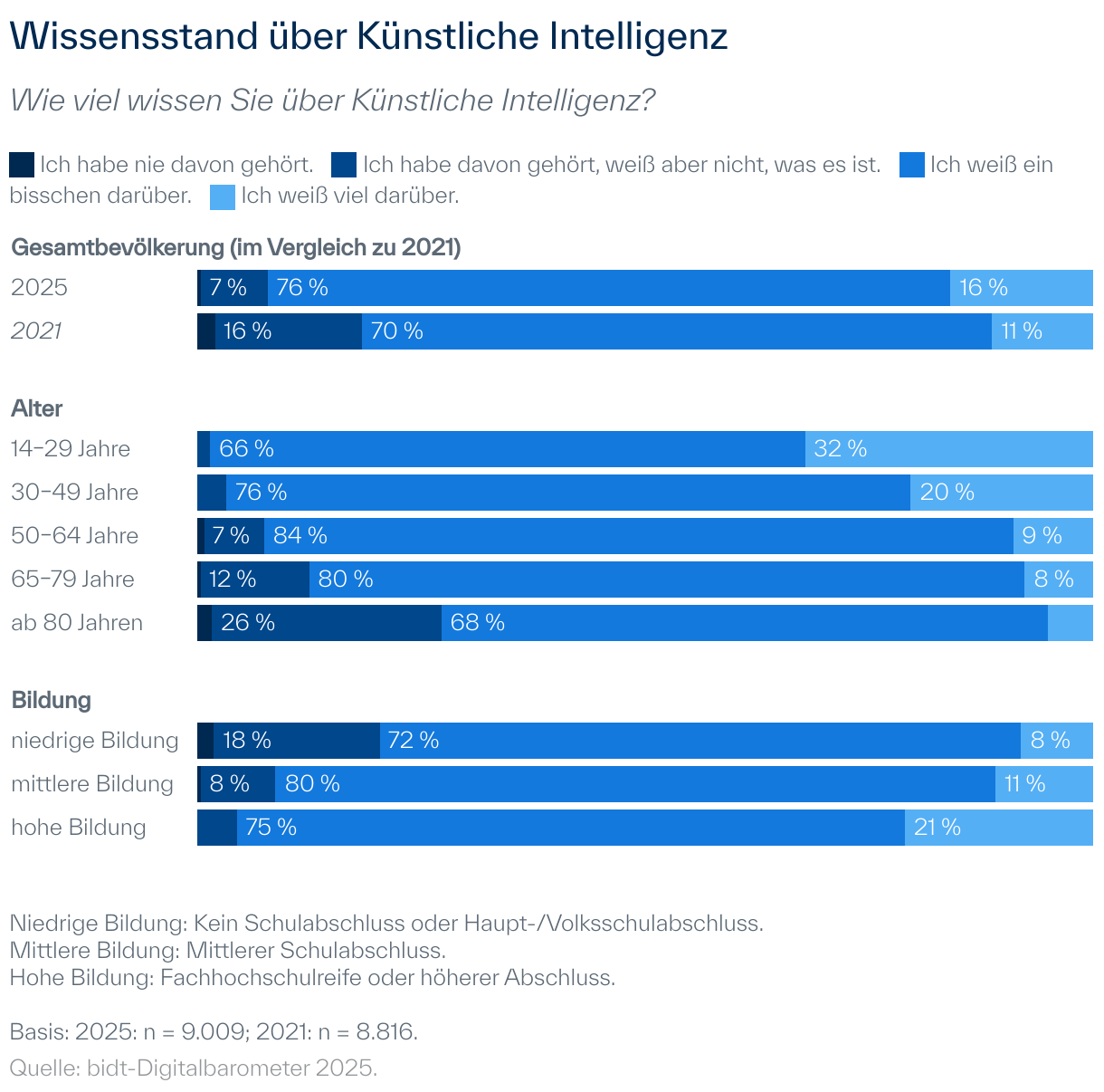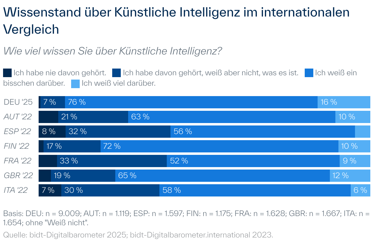 In Deutschland geben mehr als 90 % an, mindestens ein bisschen Wissen über Künstliche Intelligenz (KI) zu besitzen. Nur etwa 0,5 % geben an, noch nie von Künstlicher Intelligenz gehört zu haben. Knapp 7 % geben an, davon gehört zu haben, aber nicht zu wissen, was KI eigentlich ist.